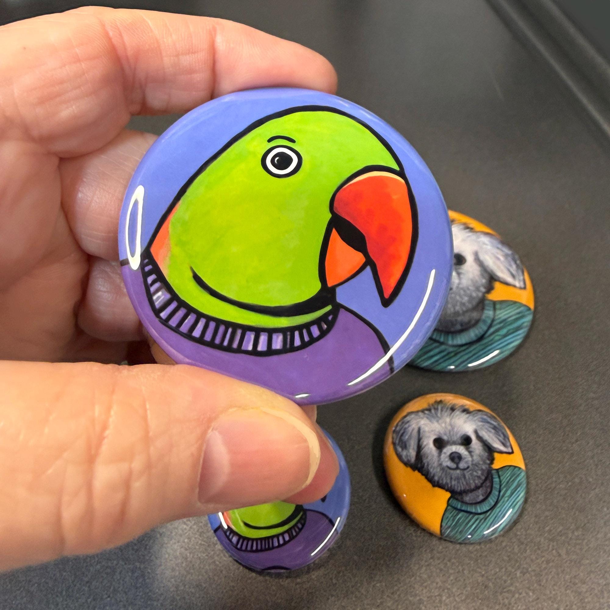 All animal magnets, mirrors, and pins are made in my Annapolis, Maryland studio. I use high quality prints of my original art, professional button parts, and a hand cranked button maker. Bird magnets are a cute addition for your fridge, filing cabinet, magnetic white board, and more. Bird pin back buttons are fun to wear and collect. Pocket mirrors are great for your purse, desk, or give as a gift.